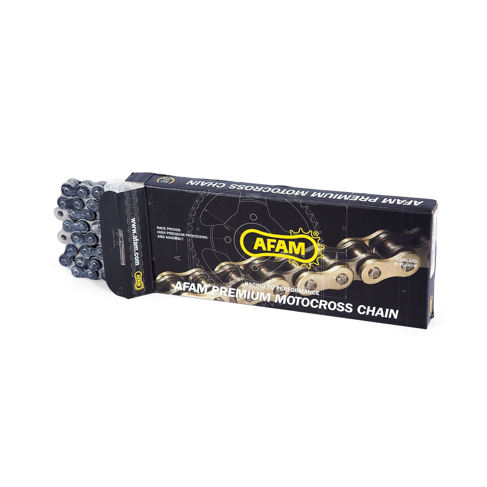 L'attuale top di gamma AFAM per il motocross professionale. Realizzate con acciaio di altissima qualità, perni cromati, boccole e rulli forgiati e piastrine leggerissime. Sono state adottate soluzioni tecniche per limitare l'insorgere dei giochi fra i vari elementi per evitare la formazione di punti duri? e mantenere un'ottima scorrevolezza nel tempo. Trattamento termico che aumenta la resistenza alla fatica, ciò si traduce in un inferiore allungamento, quindi una maggior durata.