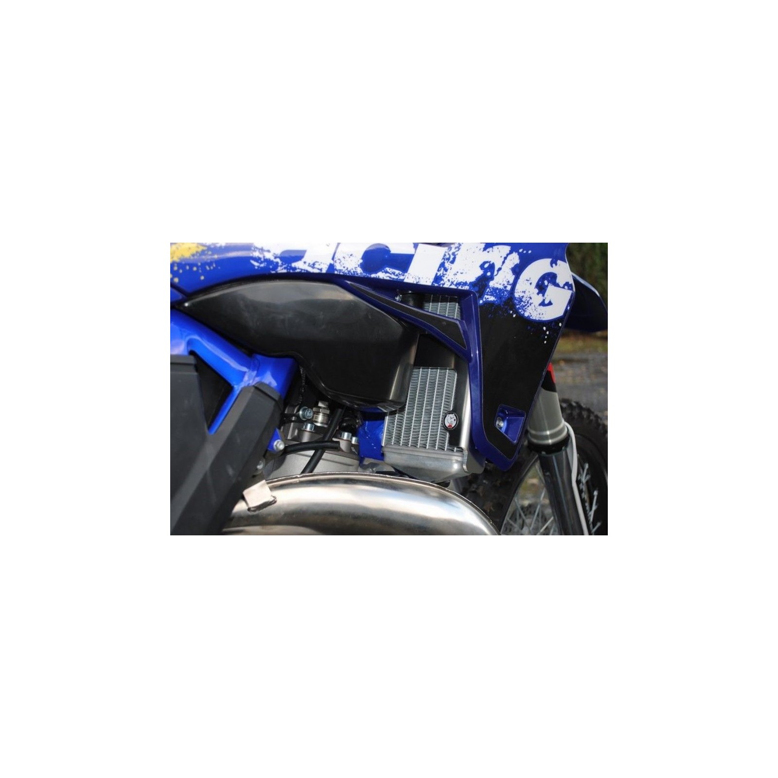 Questo sistema permette di mantenere i deflettori dell'aria originali, non riduce il massimo angolo di sterzo del manubrio e forma una vera gabbia protettiva attorno ai radiatori.