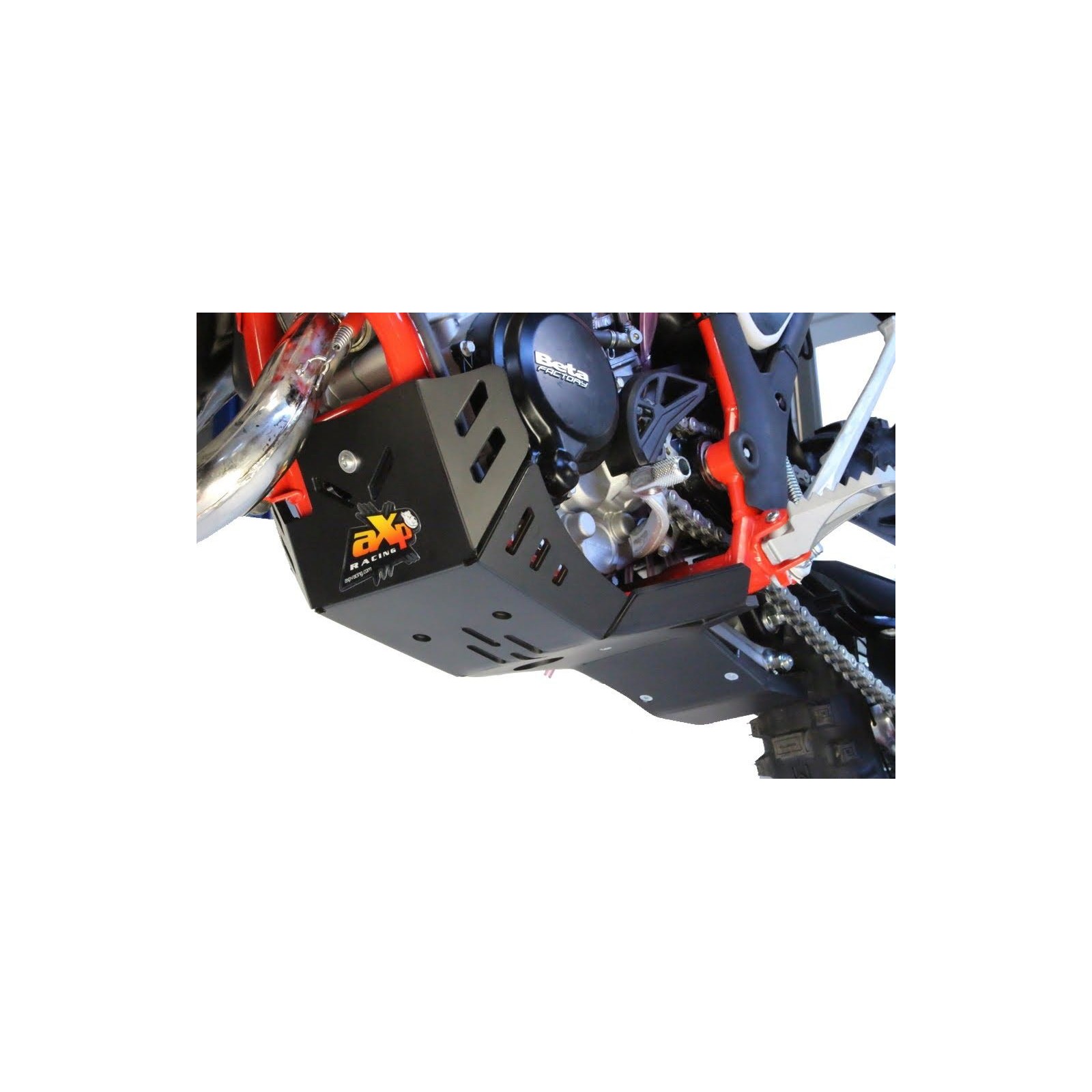 Costruita in polietilene ad alta densità (PEHD) di ben 8mm di spessore. La piastra ha ampie appendici laterali a protezione dei carter e della pompa acqua, una parte inferiore allungata per proteggere i leveraggi del monoammortizzatore e numerose asole di alleggerimento che permettono anche il drenaggio del fango. Montaggio e smontaggio molto rapido, con relative istruzioni e viteria inclusi. Questa piastra motore XTREM? di AXP soddisfa pienamente le esigenze dettate dall'enduro moderno, ove la parte inferiore della moto è spesso a contatto con gli ostacoli naturali e/o artificiali.