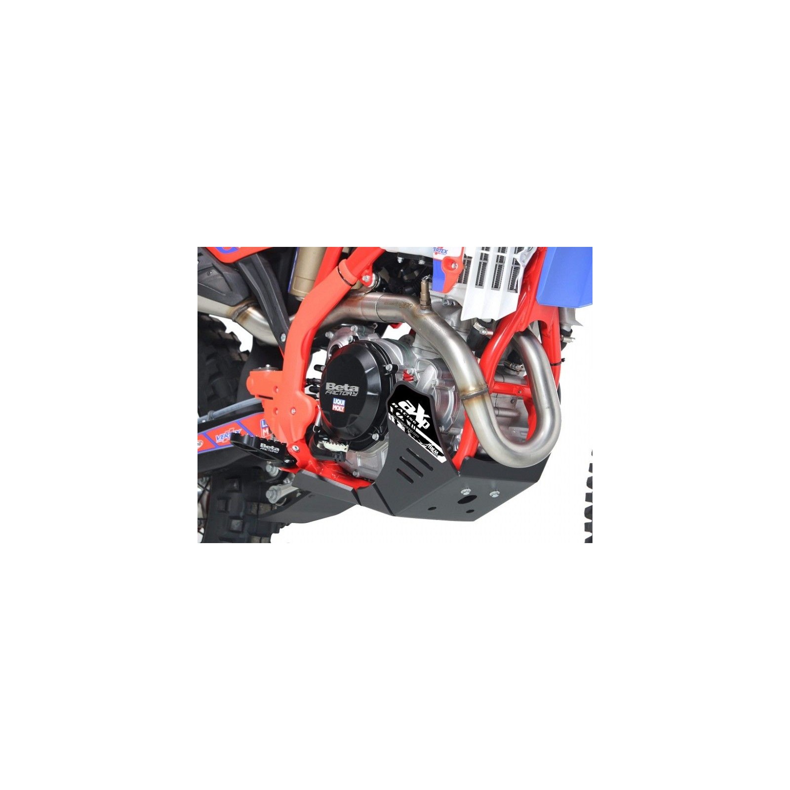 Costruita in polietilene ad alta densità (PEHD) di ben 8mm di spessore. La piastra ha ampie appendici laterali a protezione dei carter e della pompa acqua, una parte inferiore allungata per proteggere i leveraggi del monoammortizzatore e numerose asole di alleggerimento che permettono anche il drenaggio del fango. Montaggio e smontaggio molto rapido, con relative istruzioni e viteria inclusi. Questa piastra motore XTREM? di AXP soddisfa pienamente le esigenze dettate dall'enduro moderno, ove la parte inferiore della moto è spesso a contatto con gli ostacoli naturali e/o artificiali.