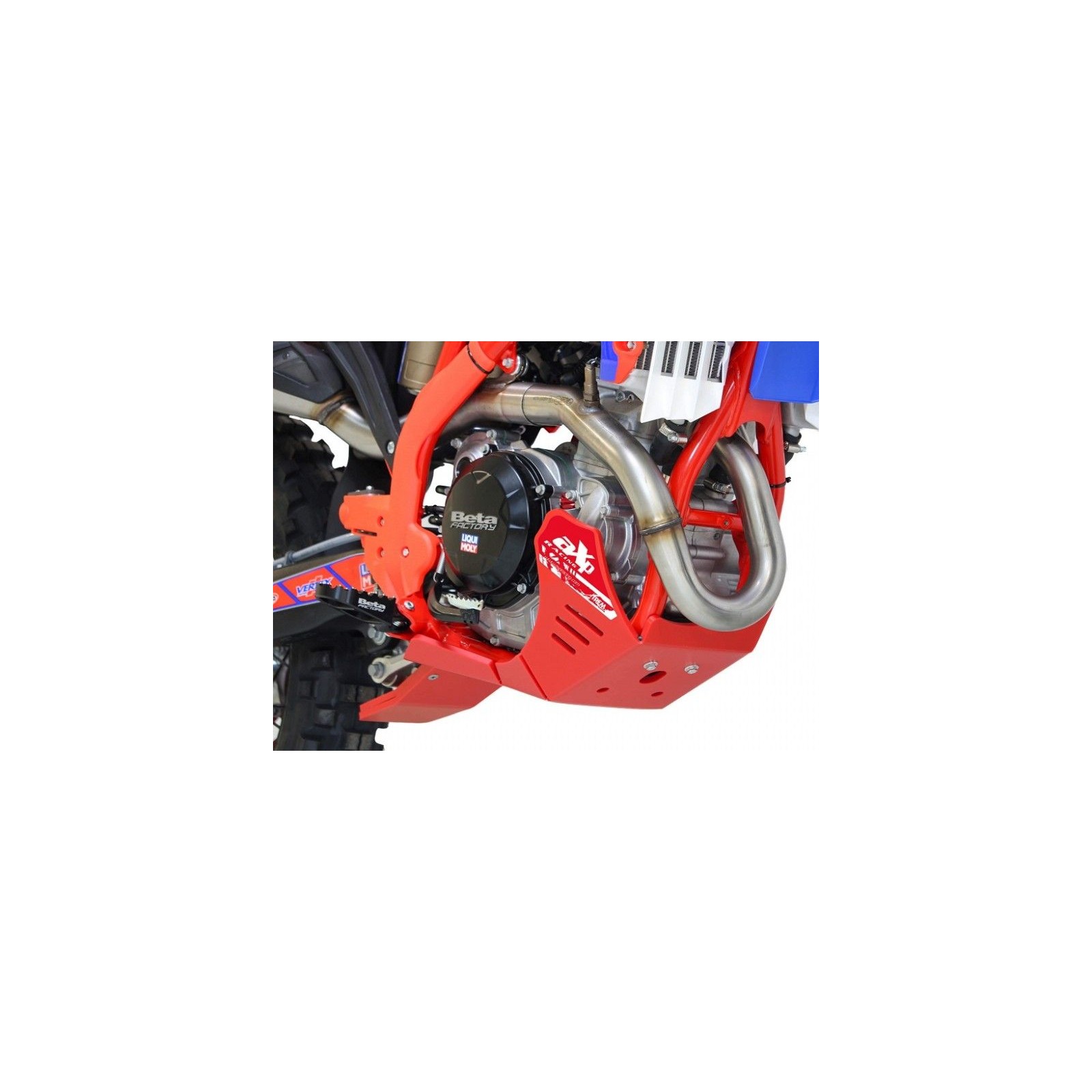 Costruita in polietilene ad alta densità (PEHD) di ben 8mm di spessore. La piastra ha ampie appendici laterali a protezione dei carter e della pompa acqua, una parte inferiore allungata per proteggere i leveraggi del monoammortizzatore e numerose asole di alleggerimento che permettono anche il drenaggio del fango. Montaggio e smontaggio molto rapido, con relative istruzioni e viteria inclusi. Questa piastra motore XTREM? di AXP soddisfa pienamente le esigenze dettate dall'enduro moderno, ove la parte inferiore della moto è spesso a contatto con gli ostacoli naturali e/o artificiali.