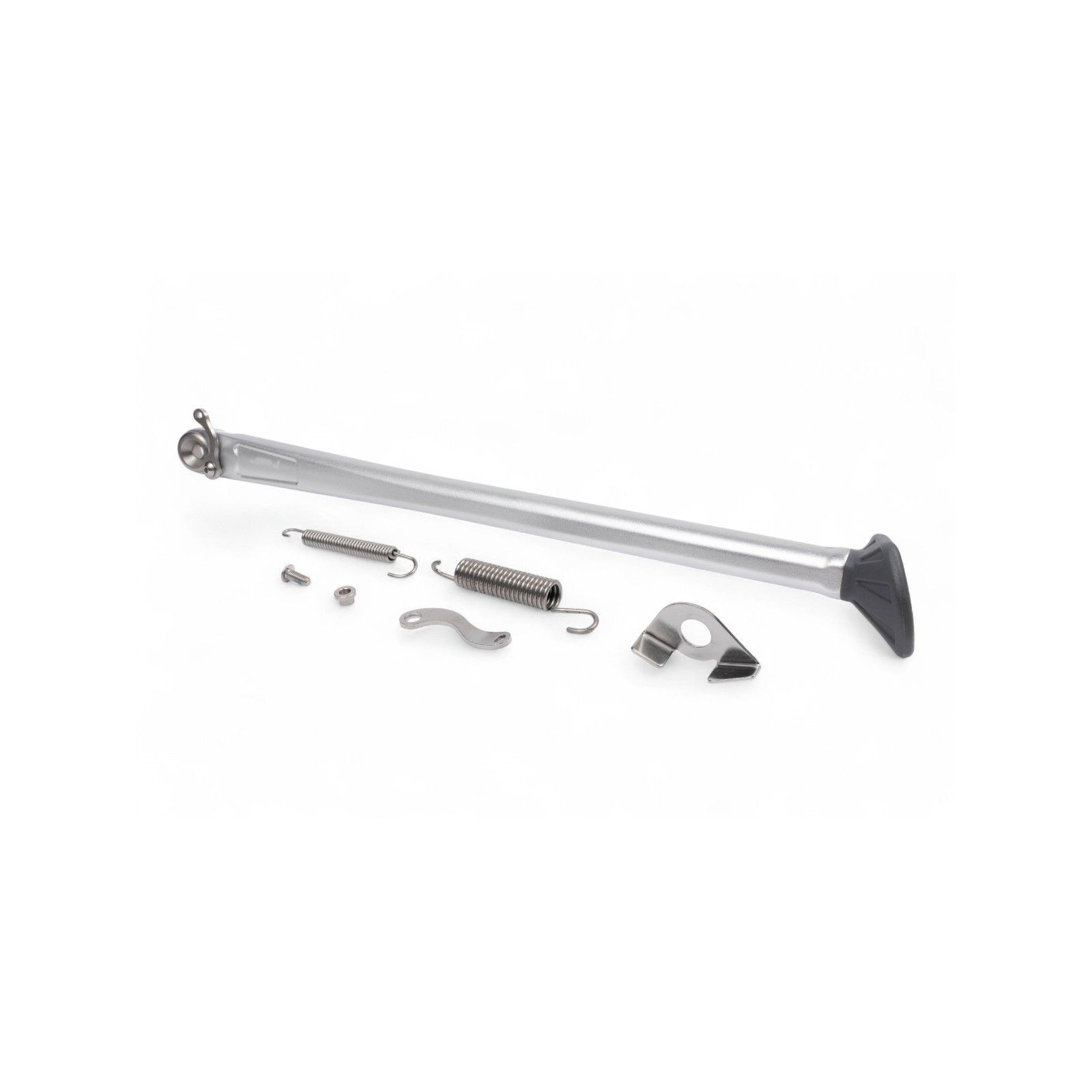 Costruito in alluminio forgiato e anodizzato, larga base d'appoggio in gomma. Si installa velocemente al posto del cavalletto originale, senza dover apportare alcuna modifica. Fornito completo delle molle, delle staffe, delle boccole e delle piastrine necessarie al montaggio.