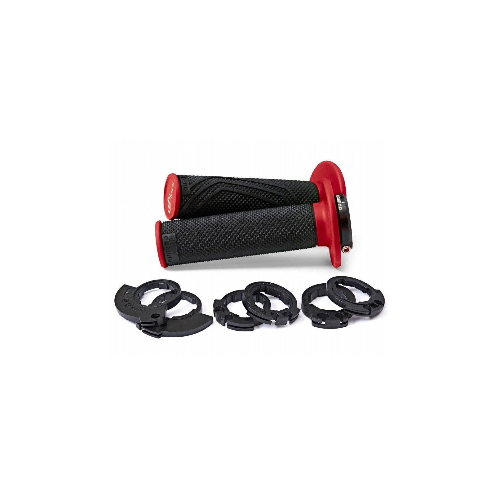 Fornite con diverse ghiere per adattarsi ad un gran numero di comandi gas; è sufficiente selezionare la ghiera, montarla sul tubo tramite i dentini di cui è dotata, posizionare la manopola lock on sul manubrio ed infine riassemblare il comando. Queste manopole hanno un diametro minimo per ridurre la stanchezza della mano e del polso, sfruttano la godronaturaHigh Grip brevettata DOMINO per un' aderenza ottimale in ogni direzione tra guanto e manopola.