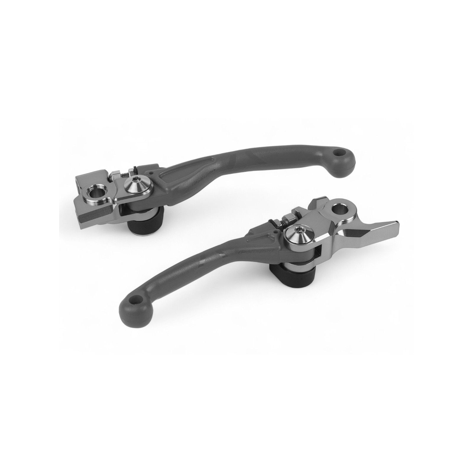 Naturale evoluzione del concetto di leva anti-rottura?. La loro peculiarità deriva dai materiali da cui sono composte: la parte che si innesta nel braccialetto portaleva, con il classico snodo che consente il ribaltamento in avanti, è realizzata con lavorazioni CNC in alluminio; la parte della leva relativa all'impugnatura è ibrida, costruita in APT (Aero Parts Technology) con un'anima di acciaio inox. L'APT è un materiale termoplastico brevettato da Polisport che simula la rigidità dell'alluminio per un identico feeling con le dita, ma dal minor peso. Grazie all'anima in acciaio inox, la leva si può piegare senza rompersi ed essere raddrizzata senza che si spezzi. Queste leve soddisfano il concetto sinora incompleto di leve anti-rottura?. Prima, la responsabilità di non rompersi era lasciata solo alla capacità della leva di ripiegarsi in avanti. Ora, che anche l'impugnatura della leva è costruita con materiali indistruttibili, il concetto è finalmente completato.