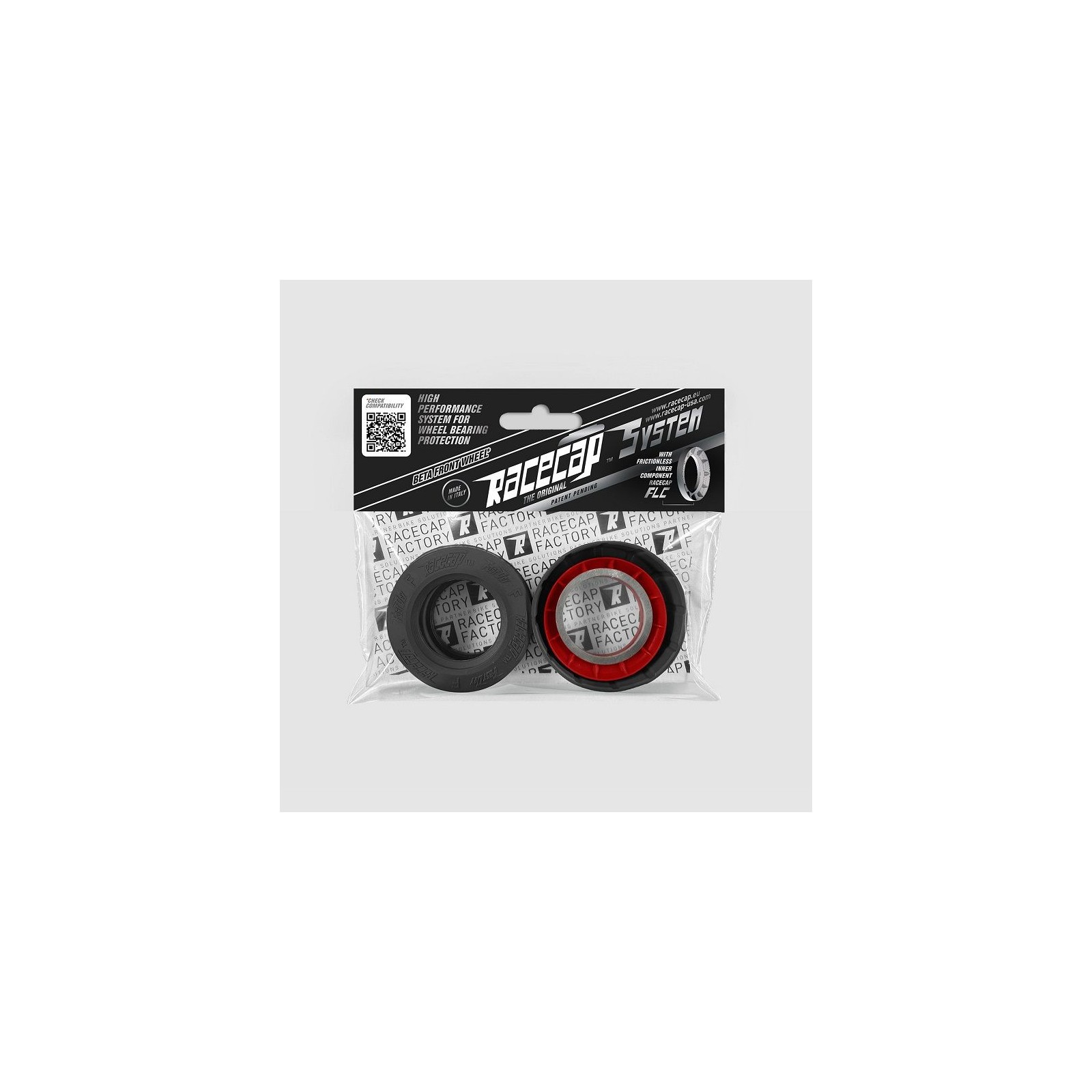 Prodotto in Italia con materiali innovati e a basso attrito. Sistema che gode di duplice brevetto, concepito per mantenere i cuscinetti delle ruote in un ambiente asciutto ed al contempo ridurre considerevolmente gli attriti. E? composto da: Cuffie di protezione Racecap FastDry, progettate con un profilo che sfrutta la differenza di conicità dei mozzi originali, creando una continuità armoniosa tra cuffia e mozzo, la cui aderenza riduce l'ingresso di sporco e acqua nei cuscinetti; Parapolvere Racecap FLC che, a differenza dei parapolvere tradizionali (che fanno tenuta sulla pista dei distanziali), fanno tenuta direttamente sui fianchi dei cuscinetti liberando? di fatto le ruote dagli attriti. I parapolvere FLC vanno a sostituire i parapolvere originali. Le peculiari sagome del sistema sfruttano l'effetto giroscopico per evacuare rapidamente gli eventuali liquidi e sporcizia riusciti a penetrare nella cuffia, evitando accumuli e ristagni, prolungando così la vita dei cuscinetti e dei distanziali. Venduto a coppia (per una ruota).