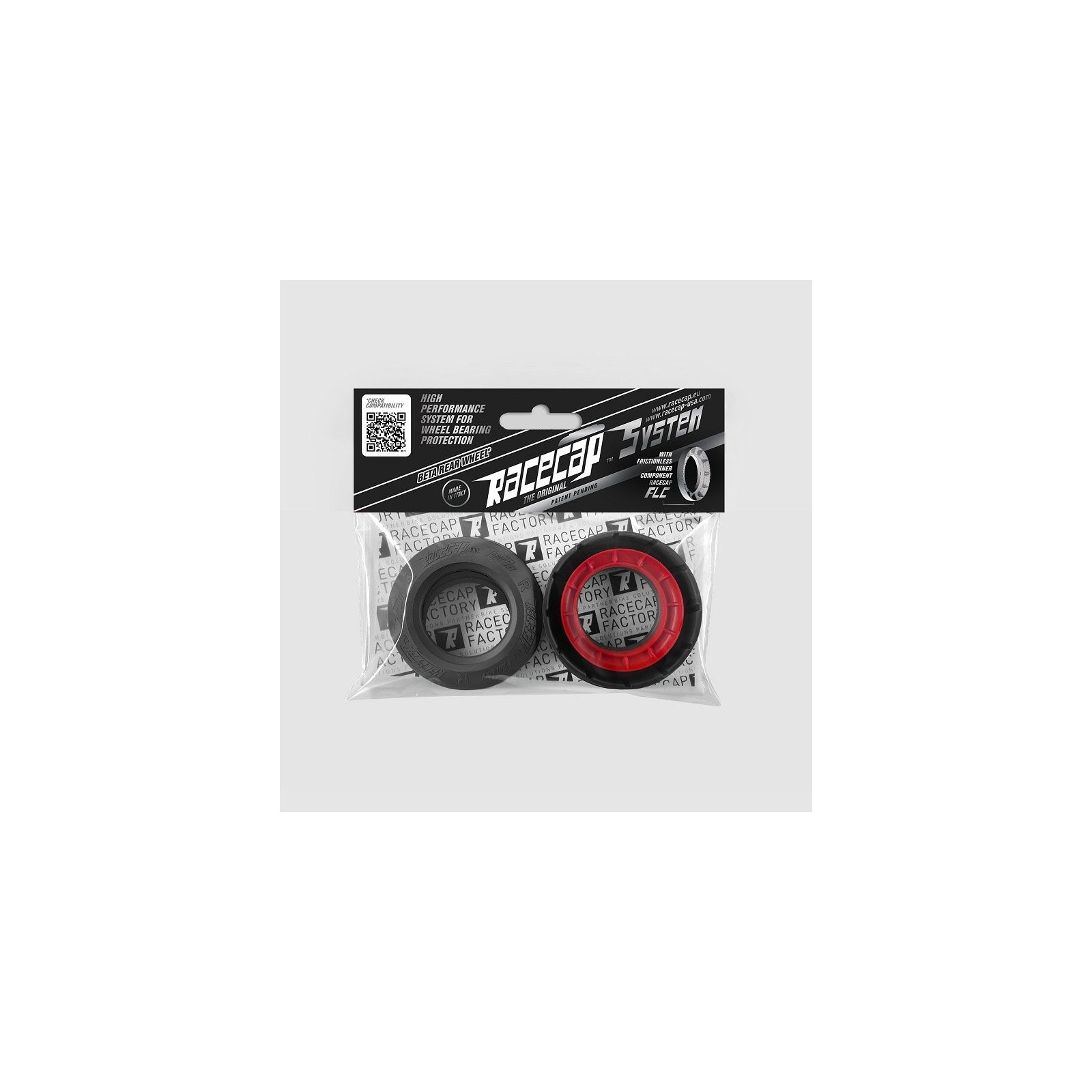 Prodotto in Italia con materiali innovati e a basso attrito. Sistema che gode di duplice brevetto, concepito per mantenere i cuscinetti delle ruote in un ambiente asciutto ed al contempo ridurre considerevolmente gli attriti. E? composto da: Cuffie di protezione Racecap FastDry, progettate con un profilo che sfrutta la differenza di conicità dei mozzi originali, creando una continuità armoniosa tra cuffia e mozzo, la cui aderenza riduce l'ingresso di sporco e acqua nei cuscinetti; Parapolvere Racecap FLC che, a differenza dei parapolvere tradizionali (che fanno tenuta sulla pista dei distanziali), fanno tenuta direttamente sui fianchi dei cuscinetti liberando? di fatto le ruote dagli attriti. I parapolvere FLC vanno a sostituire i parapolvere originali. Le peculiari sagome del sistema sfruttano l'effetto giroscopico per evacuare rapidamente gli eventuali liquidi e sporcizia riusciti a penetrare nella cuffia, evitando accumuli e ristagni, prolungando così la vita dei cuscinetti e dei distanziali. Venduto a coppia (per una ruota).