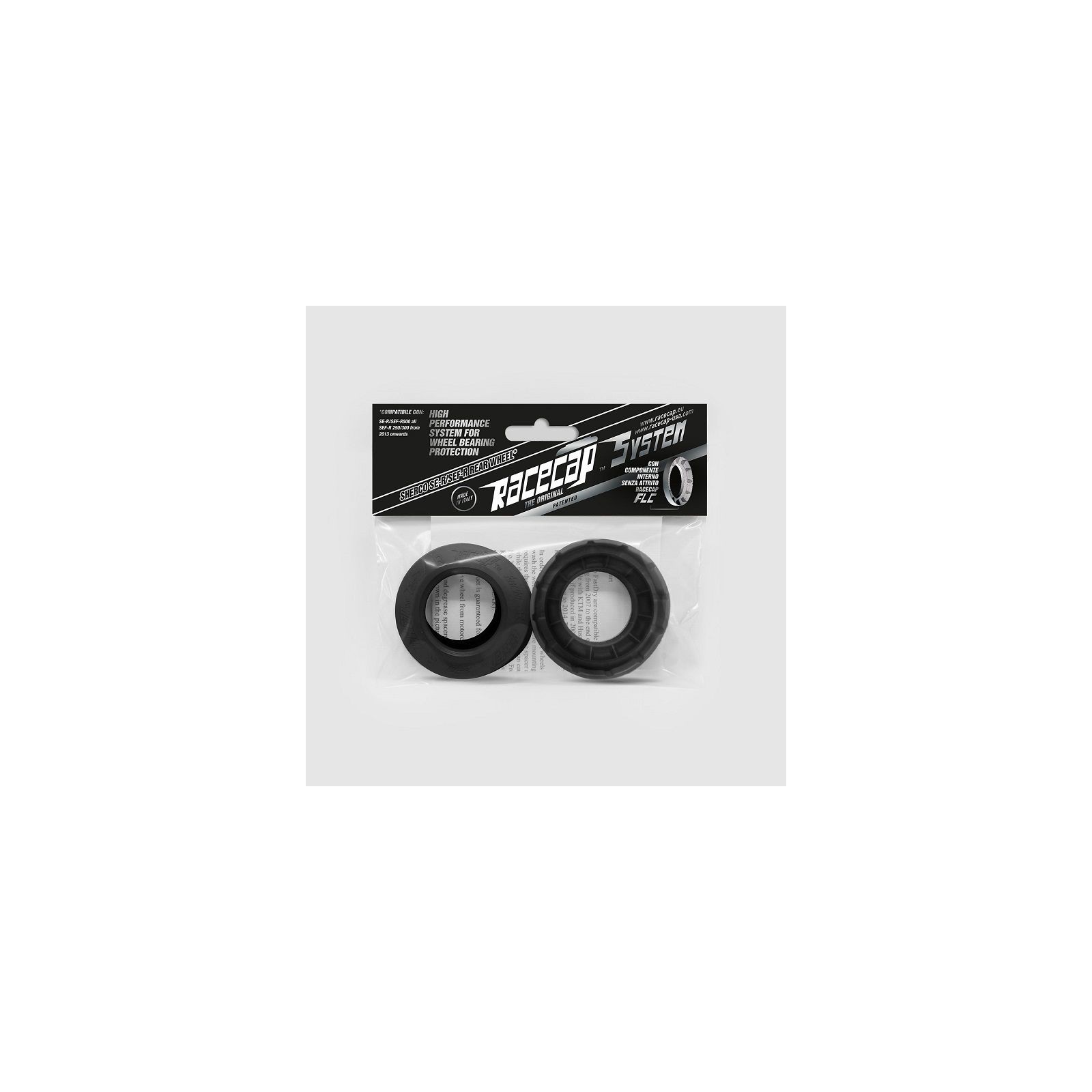 Prodotto in Italia con materiali innovati e a basso attrito. Sistema che gode di duplice brevetto, concepito per mantenere i cuscinetti delle ruote in un ambiente asciutto ed al contempo ridurre considerevolmente gli attriti. E? composto da: Cuffie di protezione Racecap FastDry, progettate con un profilo che sfrutta la differenza di conicità dei mozzi originali, creando una continuità armoniosa tra cuffia e mozzo, la cui aderenza riduce l'ingresso di sporco e acqua nei cuscinetti; Parapolvere Racecap FLC che, a differenza dei parapolvere tradizionali (che fanno tenuta sulla pista dei distanziali), fanno tenuta direttamente sui fianchi dei cuscinetti liberando? di fatto le ruote dagli attriti. I parapolvere FLC vanno a sostituire i parapolvere originali. Le peculiari sagome del sistema sfruttano l'effetto giroscopico per evacuare rapidamente gli eventuali liquidi e sporcizia riusciti a penetrare nella cuffia, evitando accumuli e ristagni, prolungando così la vita dei cuscinetti e dei distanziali. Venduto a coppia (per una ruota).