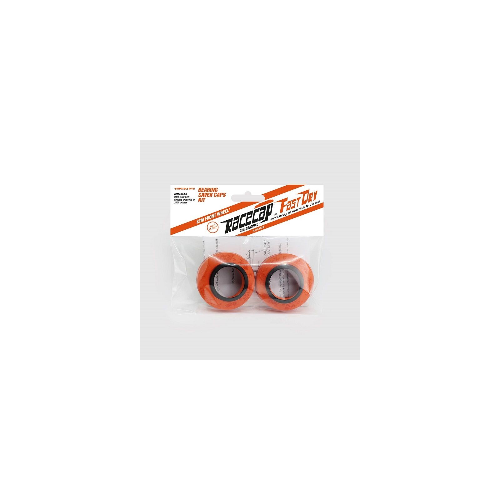 Le cuffie di protezione Racecap FastDry sono brevettate e prodotte in Italia con materiali innovativi. Sono concepite per proteggere i cuscinetti delle ruote mantenendoli in un ambiente pulito e asciutto durante l'uso della moto e durante il lavaggio con l'idropulitrice. Progettate con un profilo che sfrutta la differenza di conicità dei mozzi originali, creando una continuità armoniosa tra cuffia e mozzo, la cui aderenza riduce l'ingresso di sporco e acqua nei cuscinetti. Si installano direttamente sui distanziali originali. Venduto a coppia (per una ruota).