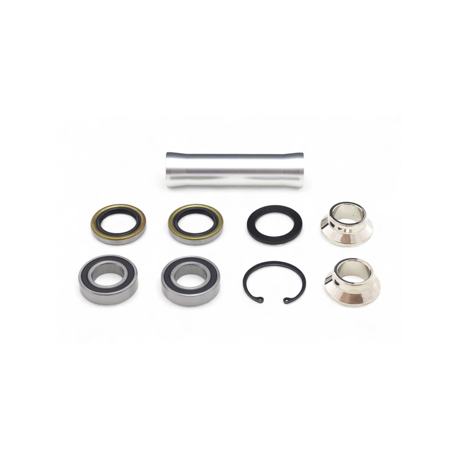Composto da tutto il necessario per revisionare correttamente l'asse della ruota. Oltre ai cuscinetti, ai parapolvere ed ai distanziali, nel kit è presente anche il tubo distanziatore posto fra i due cuscinetti. La sostituzione del tubo distanziatore, usurato o con la testa ricalcata?, è molto importante al fine dell'efficace rotolamento della ruota.